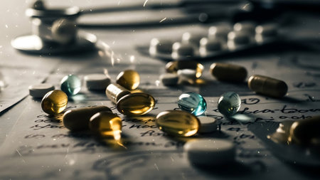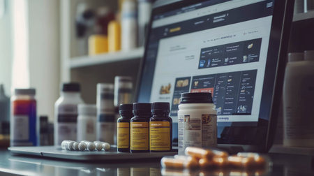 This image features a well-organized workspace with medical documents, assorted tablets, and a laptop, ideal for health professionals or students focused on wellness and productivity.