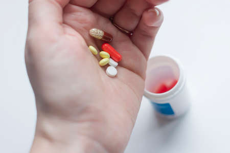Hand holding different pills for medication of illness