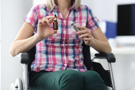 Woman in wheelchair is holding marijuana and an electronic cigarette. Marijuana for pain relief concept