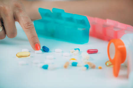 top view of senior women hands taking medicine from a pill box