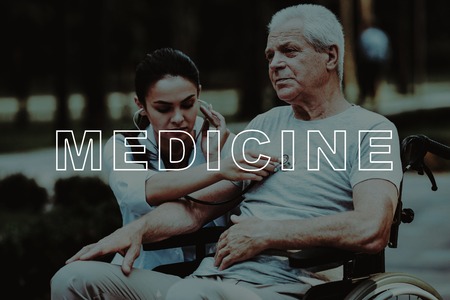 Doctor Examines Old Man with Stethoscope. Disabled in Wheelchair. Man in Park. Man Sit in Wheelchair. Outdoor Rehabilitation. Good Medicine in Nursing Home. Man Retirement. Doctor Treats Patient.