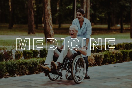 People Fool Around Park. Doctor Ride Patient. Man Sit in Wheelchair. Good Medicine in Nursing Home. Outdoor Rehabilitation. Disabled in Wheelchair. Smiling Old Man in Sunny Park. Old Man Retirement.