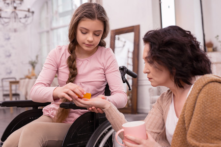 Prescript pills. Concentrated handicapped girl putting pills in female hand who holding mug