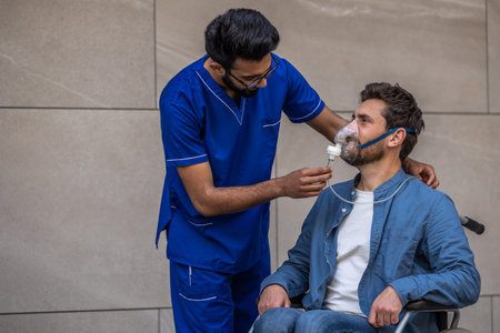 Male nurse putting an oxygen mask on a patient in wheelchair
