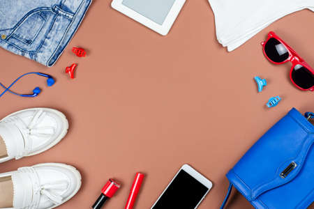 Woman accessories and clothing in red and blue colors on a neutral background