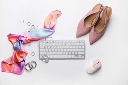Female fashion accessories on white background, view from above