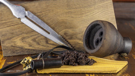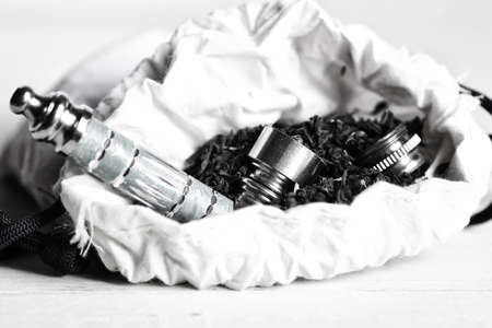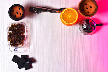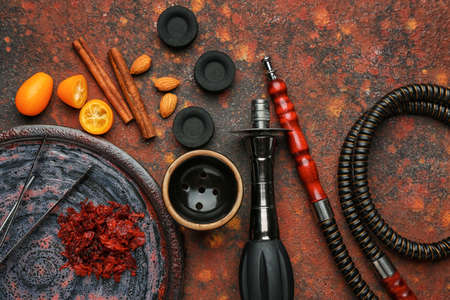 Tobacco for hookah with clay bowl and various accessories for making hookah. Accessories for shisha. Space for text. Various accessories for making water pipe tobacco.