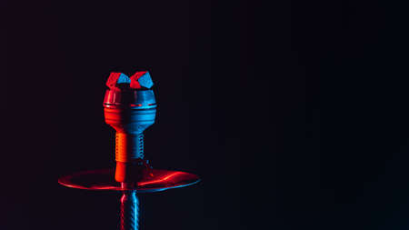 hookah bowl, shisha and coals close-up on a black background with colored lighting