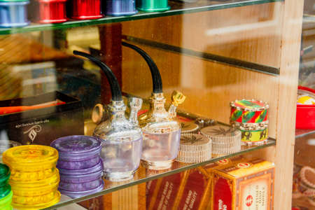 Amsterdam, Holland; 04 30 2016. Legal sale of Marijuana and related products with this and other psychotropic substances in a storefront of Amsterdam. Typical products of the Dutch culture.