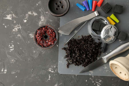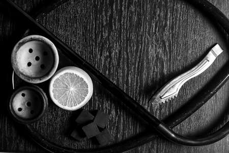 Various accessories for making hookah tobacco, bowl, coal, mouthpiece, on a dark background. accessories for making hookah. top view with space for text
