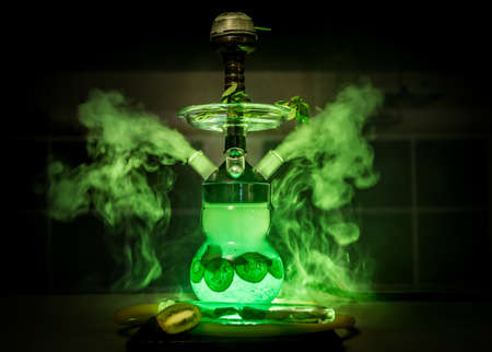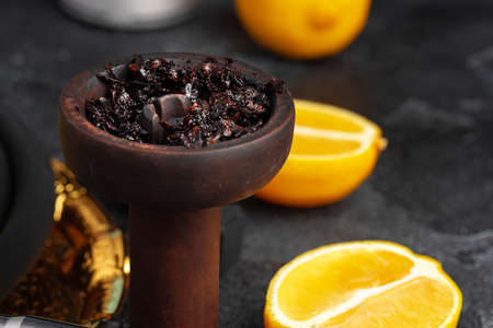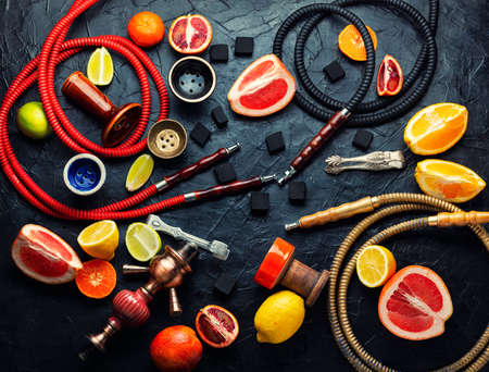 Fragrant smoking hookah or shisha with tobacco from fresh citrus fruits. High quality photo.