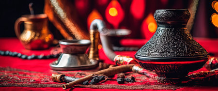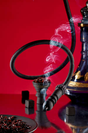 Smoke streaming from a hookah pipe, curved in a spiral, against a beautiful hookah, a plate with shisha and cubes of coconut charcoal, on a scarlet background with reflections.