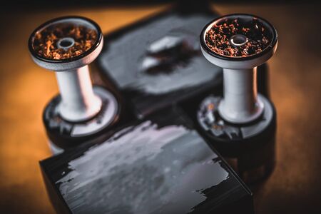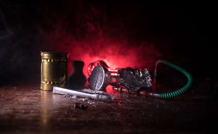 Shisha concept. Preparing shisha on table. Used shisha bowl on wooden table. Dark atmosphere with light. Selective focus.