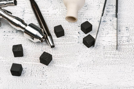 Hookah components set, bowl, hose, charcoal cubes, and fresh tobacco