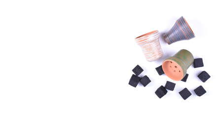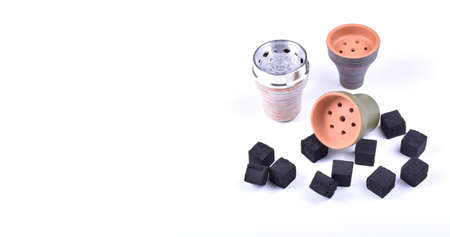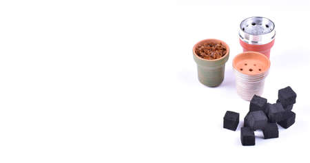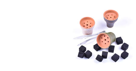 Hookah bowls with tobacco and charcoal for smoking on a white background. Space for text. Banner