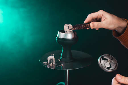 Hookah hot coals on shisha bowl making clouds of steam at dark room. Stylish oriental shisha in dark with backlight. Selective focus.