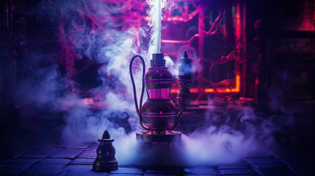 hookah close-up with smoke on a background.Hookah with a glass flask and a metal bowl shisha no smoke.Bowl of hookah with kaloud lotus, saucer and tongs, smoke around.a bowl of hookah coals in the smoke.created with the help of artificial intelligence.