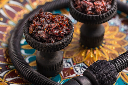 Shisha in black burnt ceramic bowls stands on a beautiful plate with a bright Oriental pattern. Traditions of hookah Smoking.