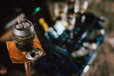 The embers in the bowl of the hookah with interior background. close-up with stylish table