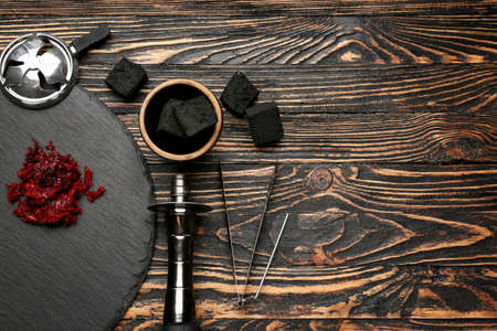 Parts of hookah and coal on wooden background