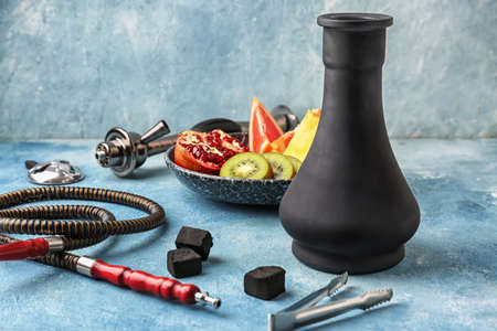 Parts of hookah and fruits on color table