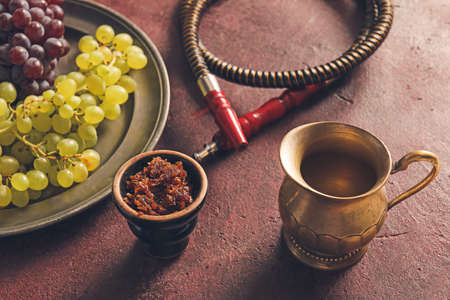 Parts of hookah, tobacco and grape on grunge background