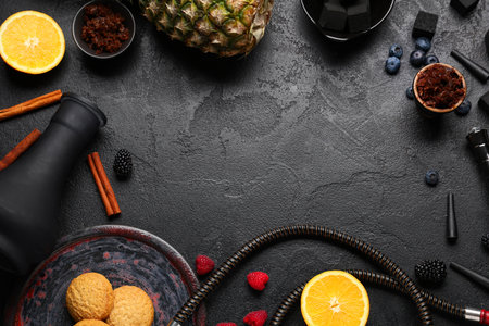 Frame made of hookah parts with tobacco, fruits, berries and cinnamon sticks on black grunge background