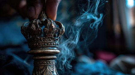 An ornate crown is held by a hand, highlighted by soft lighting against a blurred backdrop. Wisps of smoke curl around the crown, creating an ethereal effect. The composition uses a shallow depth of field, emphasizing texture and detail. This image is suitable for various commercial uses, including artistic designs and conceptual illustrations.