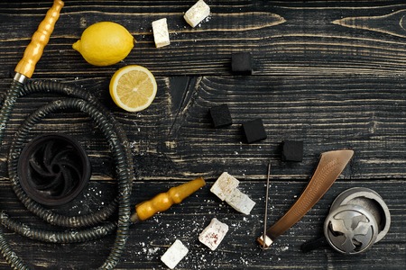 Arabic hookah with a tobacco flavor of a mixture of lemon. Top view of a dark wooden background. Still life. Copy space. Flat lay