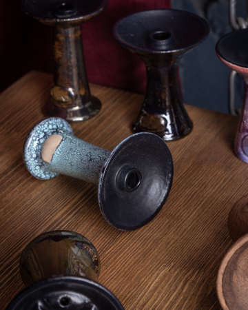 Shisha concept. Broken shisha bowl on wooden table. Dark atmosphere with light. Selective focus.