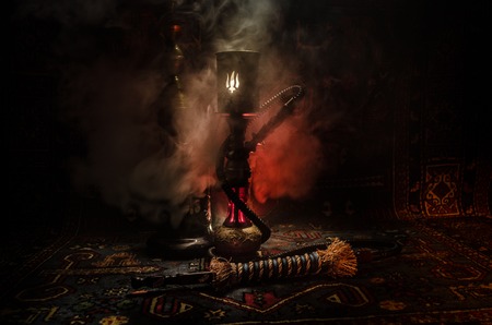 Hookah hot coals on shisha bowl making clouds of steam at Arabian interior. Oriental ornament on the carpet. Stylish oriental shisha in dark with backlight.