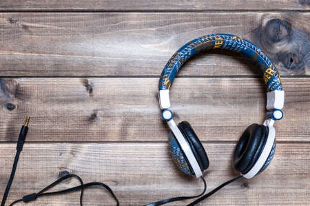 Top view of an audio headphone covered with fabric jeans, photographed on rustic wooden background