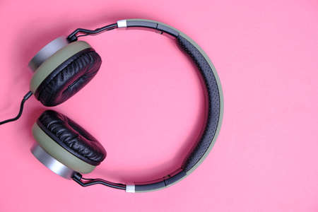 Red headphones on pink background. Minimalist simple photo of earphones with copy space, banner. Red dj headphones with cable isolated on colorful backdrop, flat lay top view. Music concept