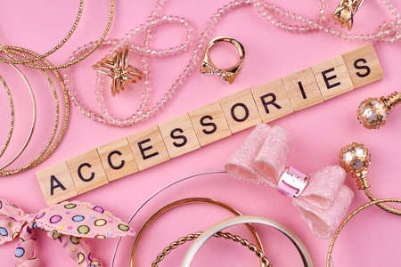 Female jewelry on pink background. Bangles, rings and earrings on color surface. Wooden cubes with inscription accessories.