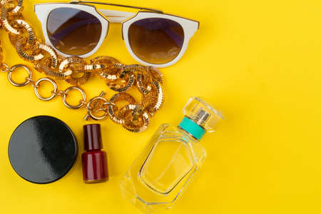 Retro sunglasses, gold rings, various hair accessories and make up products on vibrant yellow background. Selective focus.