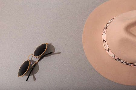 summer travel accessories. camera, hat, glasses and a flat Notepad top view lay flat on a light background