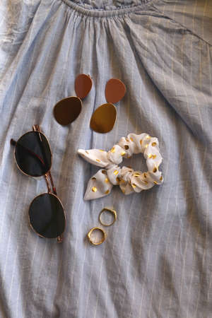 Blue linen shirt, sunglasses, white scrunchie, gold rings and fashionable earrings. Flat lay.