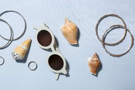 Sunglasses, straw hat, shells and jewelry in neutral colors. Seasonal summer accessories on white background. Flat lay.
