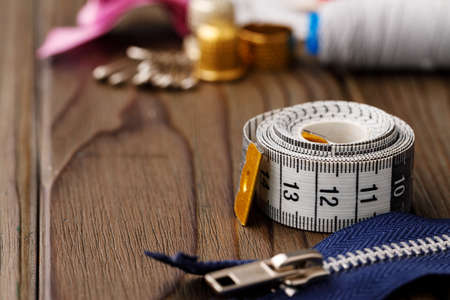 tailor the tool to measure the length, spools of colored thread on a wooden background