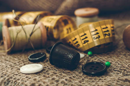 Retro tools for the work of a tailor, seamstress, fashion designer. Needle with thread, scissors, thimble, buttons and centimeter.