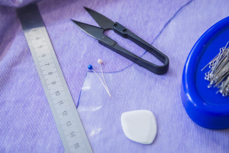 Top view: professional equipment and tools for sewing: pins, thread snips, needles, piece of cloth, chalk, ruler on table at atelier. Fashion, needlework, tailoring, hobby, clothing repair concept