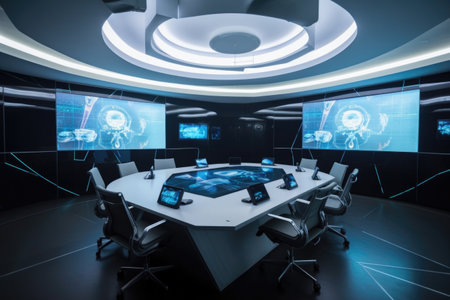 high-tech meeting room with futuristic design and holographic projection, created with generative ai