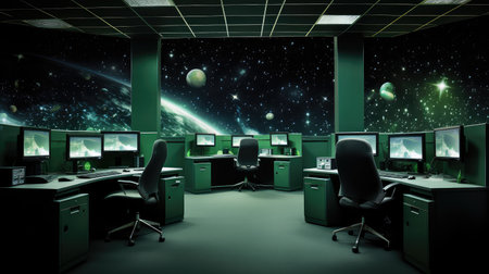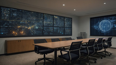 Interior of a modern conference room with computer monitors and world map
