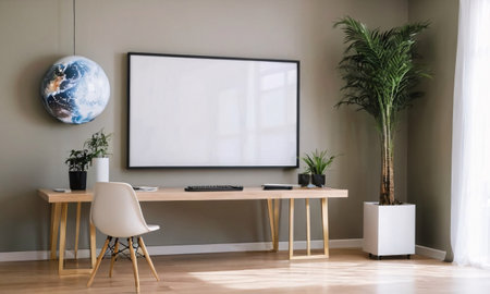 Modern office interior with blank picture frame on wall. Space for text
