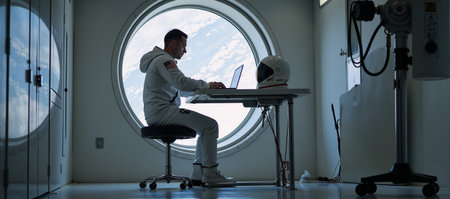 Astronaut sitting at desk working on laptop