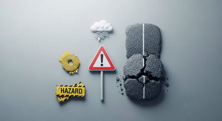 showing hazard warning symbols and broken road on light grey background. resolution use.