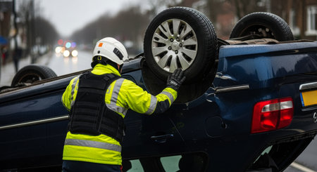 Emergency worker in a high visibility jacket inspecting an overturned blue car on a wet road after a traffic accident. scene of a serious vehicle collision.