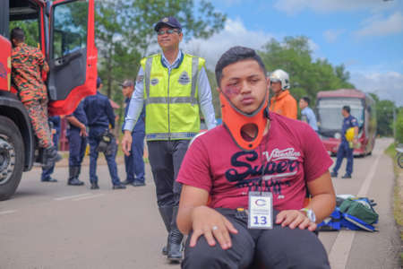 Muadzam Shah, Malaysia - October 18th, 2018 : Young man injured looks stressful, sitting on wheelchair Inter Agency Disaster Training Program 2018 at Muadzam Shah.