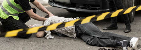 Medic with car driver applying first aid to the injured man lying on the pedestrian crossing after the road accident