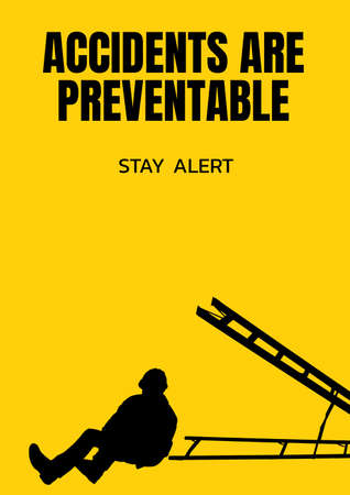 Composition of accident awareness text and silhouette of man and ladder over yellow background. accident prevention communication concept digitally generated image.
